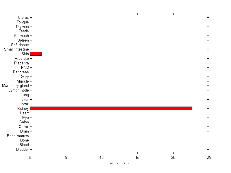 The expression level is normalized with tissue-library size. Each value for a gene in a tissue is a ratio of observed ESTs to the expected one in this tissue. The expected number of ESTs is the product of total ESTs of the gene and the fraction of total ESTs in the tissue among all ESTs in 30 tissues.