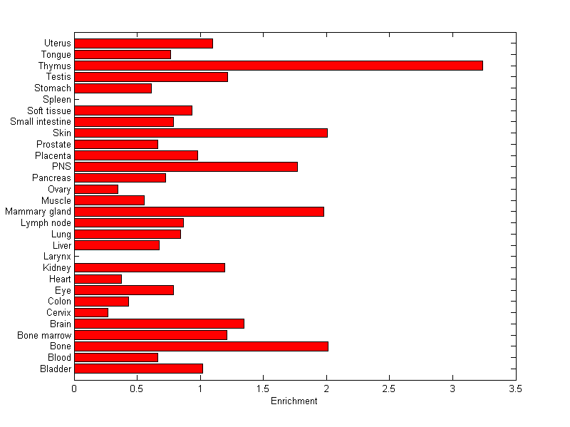 The expression level is normalized with tissue-library size. Each value for a gene in a tissue is a ratio of observed ESTs to the expected one in this tissue. The expected number of ESTs is the product of total ESTs of the gene and the fraction of total ESTs in the tissue among all ESTs in 30 tissues.