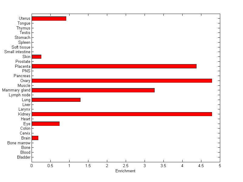 The expression level is normalized with tissue-library size. Each value for a gene in a tissue is a ratio of observed ESTs to the expected one in this tissue. The expected number of ESTs is the product of total ESTs of the gene and the fraction of total ESTs in the tissue among all ESTs in 30 tissues.