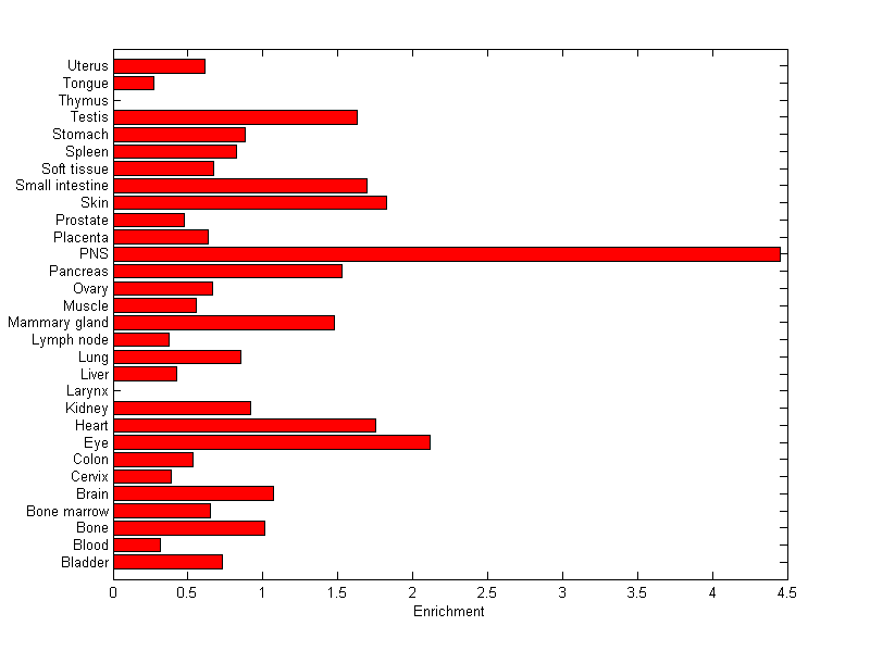 The expression level is normalized with tissue-library size. Each value for a gene in a tissue is a ratio of observed ESTs to the expected one in this tissue. The expected number of ESTs is the product of total ESTs of the gene and the fraction of total ESTs in the tissue among all ESTs in 30 tissues.