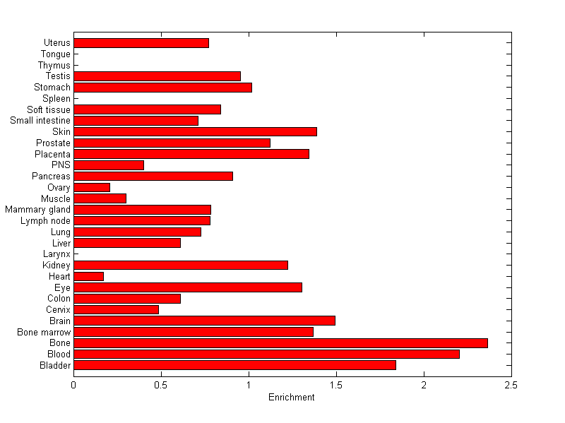 The expression level is normalized with tissue-library size. Each value for a gene in a tissue is a ratio of observed ESTs to the expected one in this tissue. The expected number of ESTs is the product of total ESTs of the gene and the fraction of total ESTs in the tissue among all ESTs in 30 tissues.