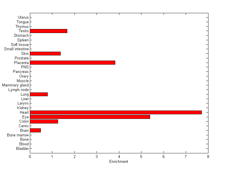 The expression level is normalized with tissue-library size. Each value for a gene in a tissue is a ratio of observed ESTs to the expected one in this tissue. The expected number of ESTs is the product of total ESTs of the gene and the fraction of total ESTs in the tissue among all ESTs in 30 tissues.