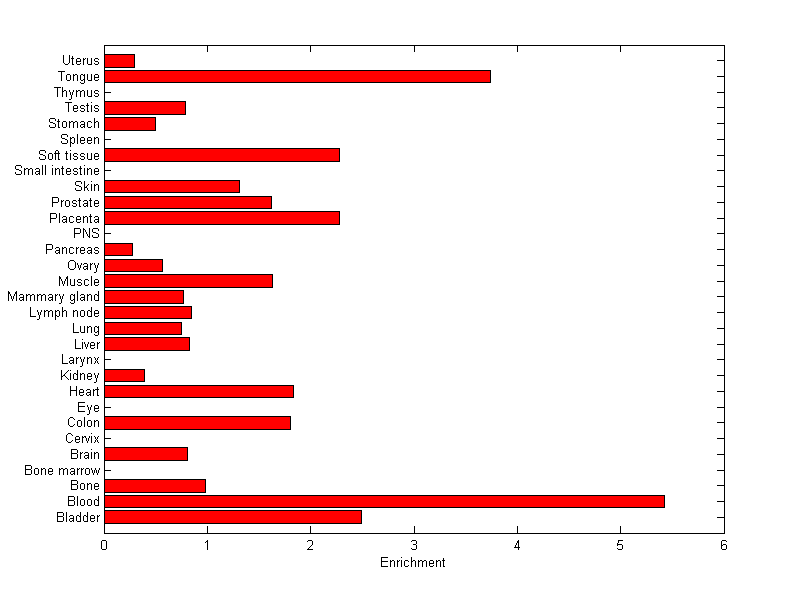 The expression level is normalized with tissue-library size. Each value for a gene in a tissue is a ratio of observed ESTs to the expected one in this tissue. The expected number of ESTs is the product of total ESTs of the gene and the fraction of total ESTs in the tissue among all ESTs in 30 tissues.