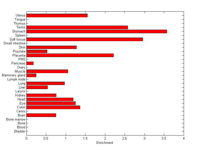 The expression level is normalized with tissue-library size. Each value for a gene in a tissue is a ratio of observed ESTs to the expected one in this tissue. The expected number of ESTs is the product of total ESTs of the gene and the fraction of total ESTs in the tissue among all ESTs in 30 tissues.
