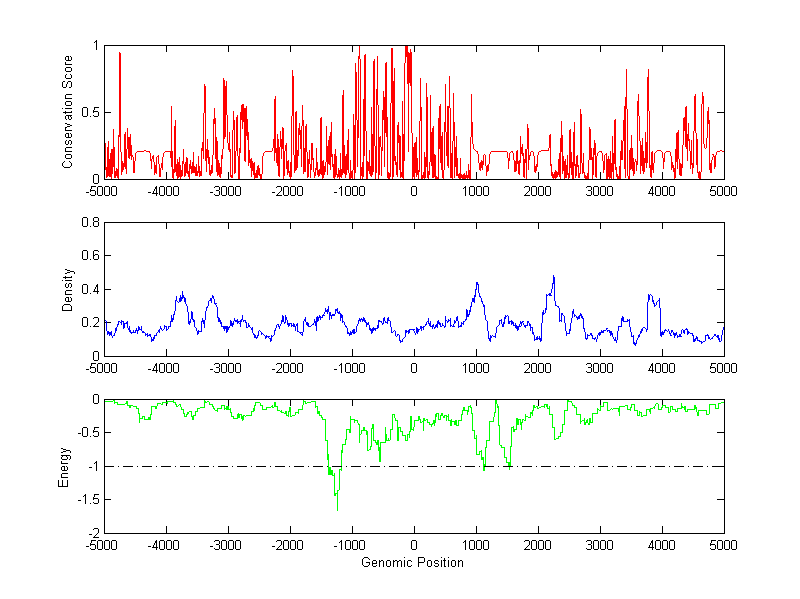 The energy profile (green curve) is about energy for module detection based on TF interaction. The positions with energy less than -1 indicate the existence of CRMs.