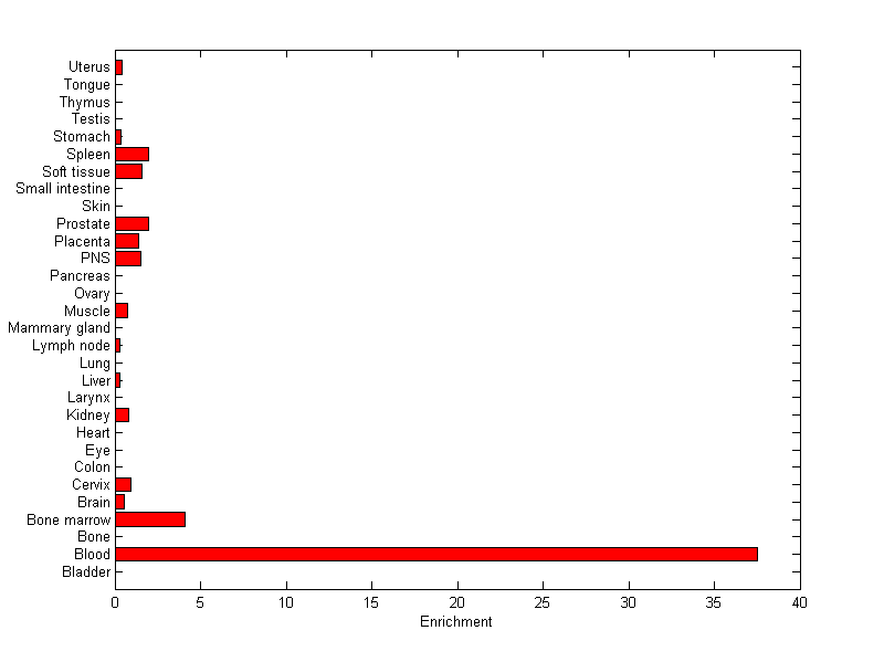 The expression level is normalized with tissue-library size. Each value for a gene in a tissue is a ratio of observed ESTs to the expected one in this tissue. The expected number of ESTs is the product of total ESTs of the gene and the fraction of total ESTs in the tissue among all ESTs in 30 tissues.