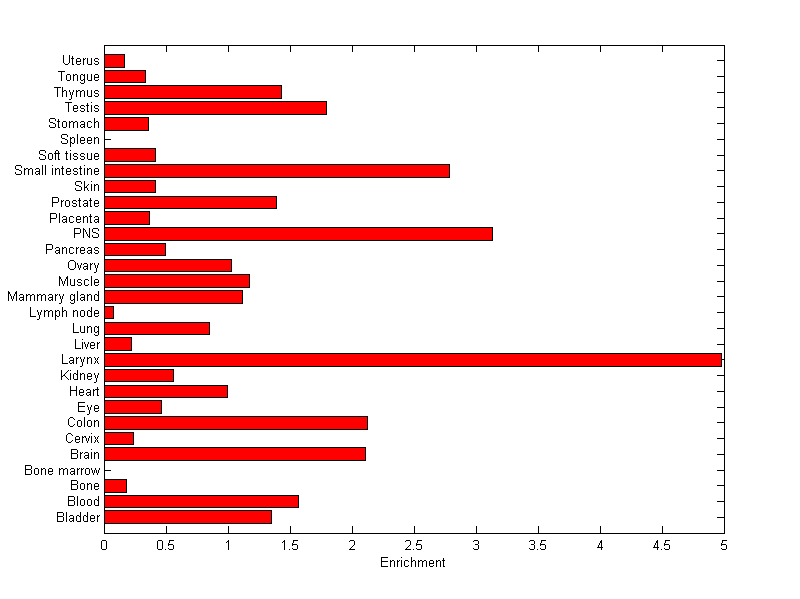 The expression level is normalized with tissue-library size. Each value for a gene in a tissue is a ratio of observed ESTs to the expected one in this tissue. The expected number of ESTs is the product of total ESTs of the gene and the fraction of total ESTs in the tissue among all ESTs in 30 tissues.