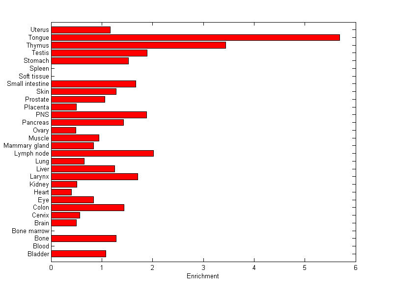 The expression level is normalized with tissue-library size. Each value for a gene in a tissue is a ratio of observed ESTs to the expected one in this tissue. The expected number of ESTs is the product of total ESTs of the gene and the fraction of total ESTs in the tissue among all ESTs in 30 tissues.