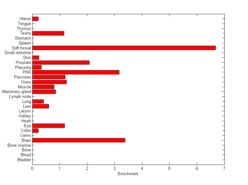 The expression level is normalized with tissue-library size. Each value for a gene in a tissue is a ratio of observed ESTs to the expected one in this tissue. The expected number of ESTs is the product of total ESTs of the gene and the fraction of total ESTs in the tissue among all ESTs in 30 tissues.