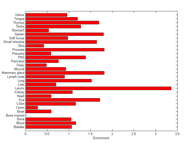 The expression level is normalized with tissue-library size. Each value for a gene in a tissue is a ratio of observed ESTs to the expected one in this tissue. The expected number of ESTs is the product of total ESTs of the gene and the fraction of total ESTs in the tissue among all ESTs in 30 tissues.