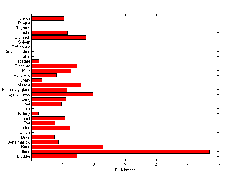 The expression level is normalized with tissue-library size. Each value for a gene in a tissue is a ratio of observed ESTs to the expected one in this tissue. The expected number of ESTs is the product of total ESTs of the gene and the fraction of total ESTs in the tissue among all ESTs in 30 tissues.