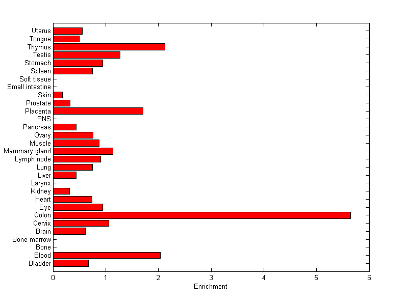 The expression level is normalized with tissue-library size. Each value for a gene in a tissue is a ratio of observed ESTs to the expected one in this tissue. The expected number of ESTs is the product of total ESTs of the gene and the fraction of total ESTs in the tissue among all ESTs in 30 tissues.