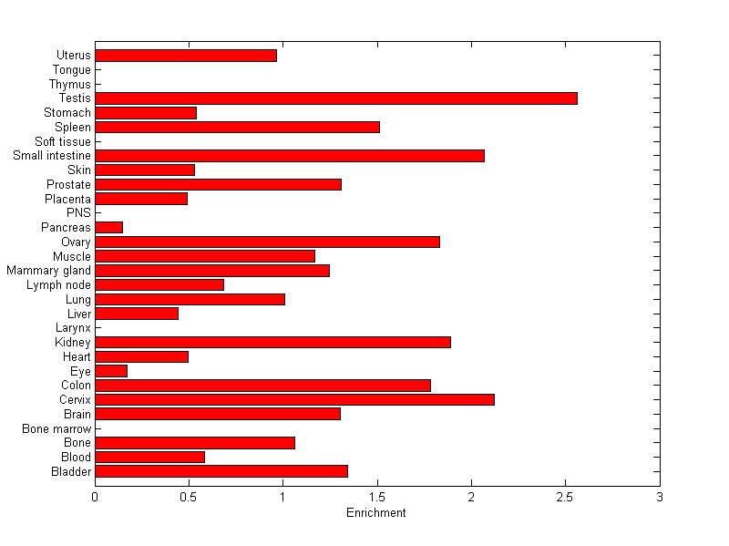 The expression level is normalized with tissue-library size. Each value for a gene in a tissue is a ratio of observed ESTs to the expected one in this tissue. The expected number of ESTs is the product of total ESTs of the gene and the fraction of total ESTs in the tissue among all ESTs in 30 tissues.