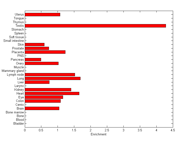 The expression level is normalized with tissue-library size. Each value for a gene in a tissue is a ratio of observed ESTs to the expected one in this tissue. The expected number of ESTs is the product of total ESTs of the gene and the fraction of total ESTs in the tissue among all ESTs in 30 tissues.