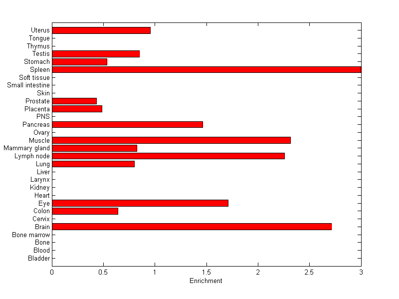 The expression level is normalized with tissue-library size. Each value for a gene in a tissue is a ratio of observed ESTs to the expected one in this tissue. The expected number of ESTs is the product of total ESTs of the gene and the fraction of total ESTs in the tissue among all ESTs in 30 tissues.