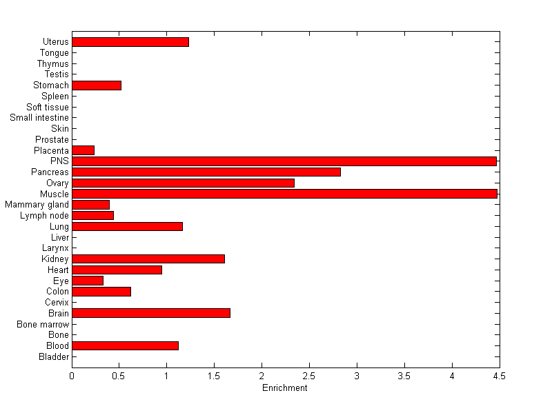 The expression level is normalized with tissue-library size. Each value for a gene in a tissue is a ratio of observed ESTs to the expected one in this tissue. The expected number of ESTs is the product of total ESTs of the gene and the fraction of total ESTs in the tissue among all ESTs in 30 tissues.
