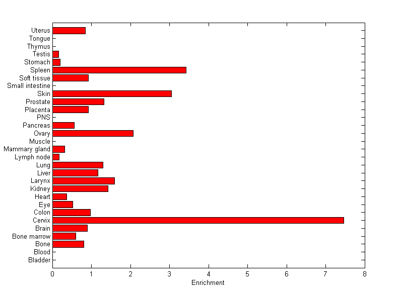 The expression level is normalized with tissue-library size. Each value for a gene in a tissue is a ratio of observed ESTs to the expected one in this tissue. The expected number of ESTs is the product of total ESTs of the gene and the fraction of total ESTs in the tissue among all ESTs in 30 tissues.