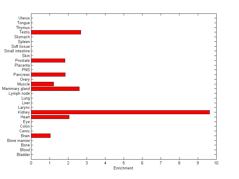 The expression level is normalized with tissue-library size. Each value for a gene in a tissue is a ratio of observed ESTs to the expected one in this tissue. The expected number of ESTs is the product of total ESTs of the gene and the fraction of total ESTs in the tissue among all ESTs in 30 tissues.