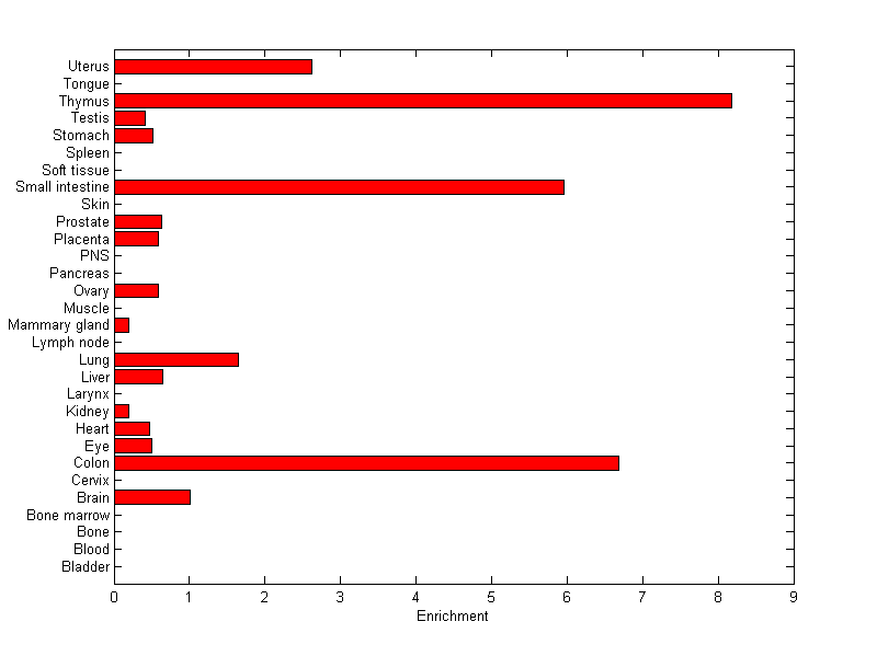 The expression level is normalized with tissue-library size. Each value for a gene in a tissue is a ratio of observed ESTs to the expected one in this tissue. The expected number of ESTs is the product of total ESTs of the gene and the fraction of total ESTs in the tissue among all ESTs in 30 tissues.