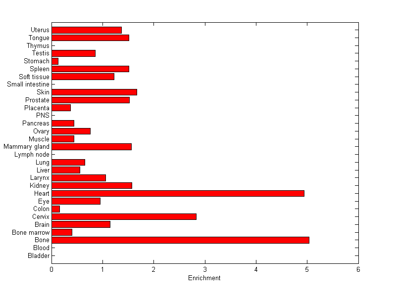 The expression level is normalized with tissue-library size. Each value for a gene in a tissue is a ratio of observed ESTs to the expected one in this tissue. The expected number of ESTs is the product of total ESTs of the gene and the fraction of total ESTs in the tissue among all ESTs in 30 tissues.