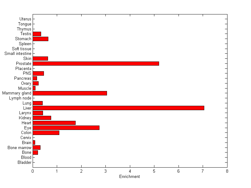About the profile: The expression level is normalized with tissue-library size. Each value for a gene in a tissue is a ratio of observed ESTs to the expected one in this tissue. The expected number of ESTs is the product of total ESTs of the gene and the fraction of total ESTs in the tissue among all ESTs in 30 tissues. Summary: This gene is preferentially expressed in [liver, prostate] Download: |