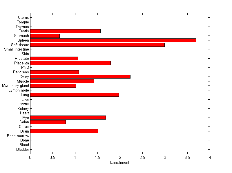 The expression level is normalized with tissue-library size. Each value for a gene in a tissue is a ratio of observed ESTs to the expected one in this tissue. The expected number of ESTs is the product of total ESTs of the gene and the fraction of total ESTs in the tissue among all ESTs in 30 tissues.