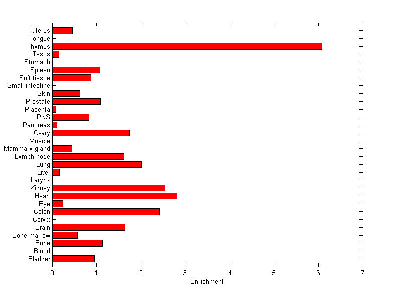 The expression level is normalized with tissue-library size. Each value for a gene in a tissue is a ratio of observed ESTs to the expected one in this tissue. The expected number of ESTs is the product of total ESTs of the gene and the fraction of total ESTs in the tissue among all ESTs in 30 tissues.