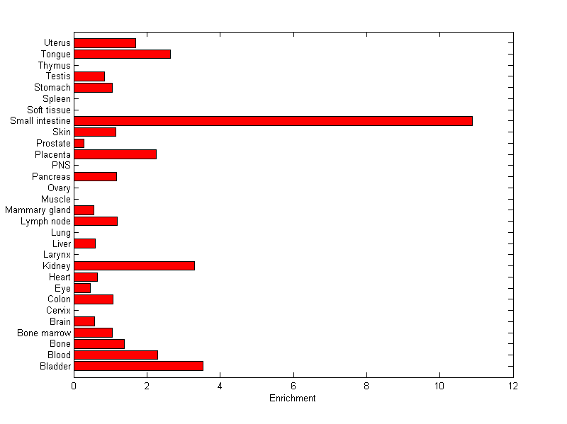 The expression level is normalized with tissue-library size. Each value for a gene in a tissue is a ratio of observed ESTs to the expected one in this tissue. The expected number of ESTs is the product of total ESTs of the gene and the fraction of total ESTs in the tissue among all ESTs in 30 tissues.
