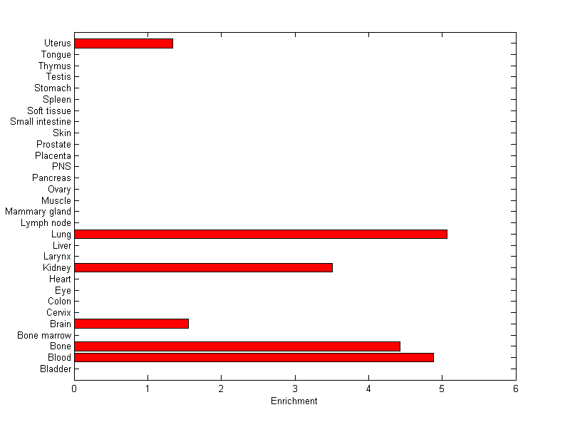 The expression level is normalized with tissue-library size. Each value for a gene in a tissue is a ratio of observed ESTs to the expected one in this tissue. The expected number of ESTs is the product of total ESTs of the gene and the fraction of total ESTs in the tissue among all ESTs in 30 tissues.