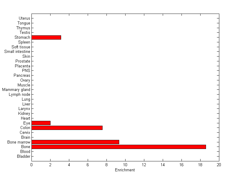 The expression level is normalized with tissue-library size. Each value for a gene in a tissue is a ratio of observed ESTs to the expected one in this tissue. The expected number of ESTs is the product of total ESTs of the gene and the fraction of total ESTs in the tissue among all ESTs in 30 tissues.