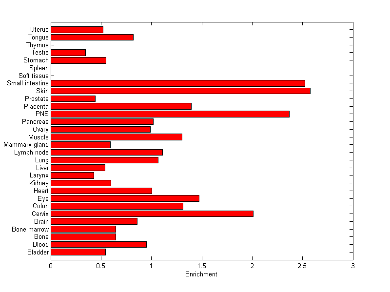 The expression level is normalized with tissue-library size. Each value for a gene in a tissue is a ratio of observed ESTs to the expected one in this tissue. The expected number of ESTs is the product of total ESTs of the gene and the fraction of total ESTs in the tissue among all ESTs in 30 tissues.