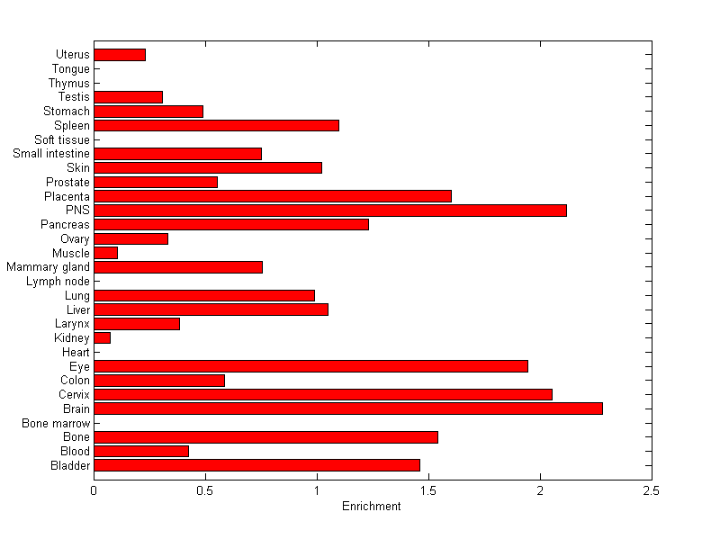 The expression level is normalized with tissue-library size. Each value for a gene in a tissue is a ratio of observed ESTs to the expected one in this tissue. The expected number of ESTs is the product of total ESTs of the gene and the fraction of total ESTs in the tissue among all ESTs in 30 tissues.