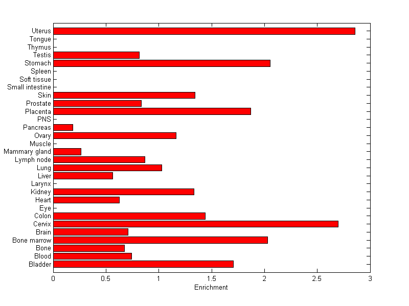 The expression level is normalized with tissue-library size. Each value for a gene in a tissue is a ratio of observed ESTs to the expected one in this tissue. The expected number of ESTs is the product of total ESTs of the gene and the fraction of total ESTs in the tissue among all ESTs in 30 tissues.