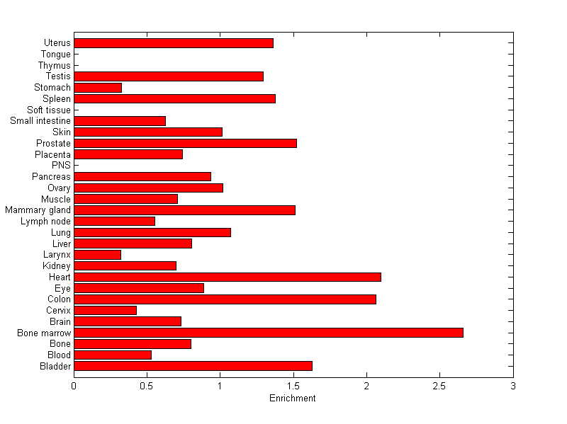 The expression level is normalized with tissue-library size. Each value for a gene in a tissue is a ratio of observed ESTs to the expected one in this tissue. The expected number of ESTs is the product of total ESTs of the gene and the fraction of total ESTs in the tissue among all ESTs in 30 tissues.
