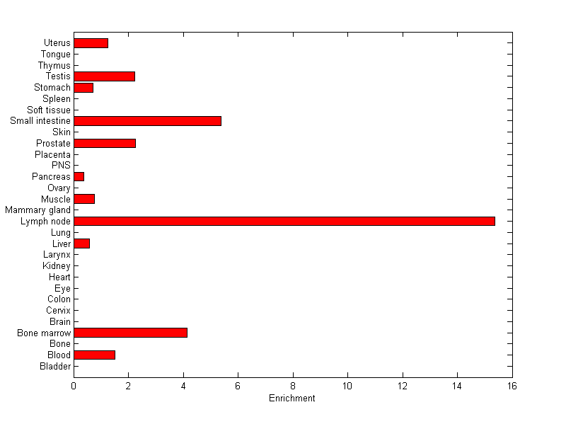 The expression level is normalized with tissue-library size. Each value for a gene in a tissue is a ratio of observed ESTs to the expected one in this tissue. The expected number of ESTs is the product of total ESTs of the gene and the fraction of total ESTs in the tissue among all ESTs in 30 tissues.