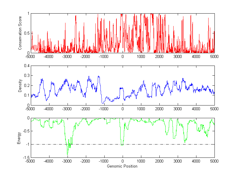 The energy profile (green curve) is about energy for module detection based on TF interaction. The positions with energy less than -1 indicate the existence of CRMs.