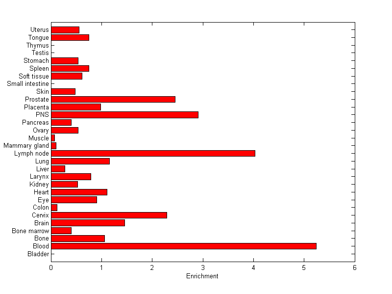 The expression level is normalized with tissue-library size. Each value for a gene in a tissue is a ratio of observed ESTs to the expected one in this tissue. The expected number of ESTs is the product of total ESTs of the gene and the fraction of total ESTs in the tissue among all ESTs in 30 tissues.