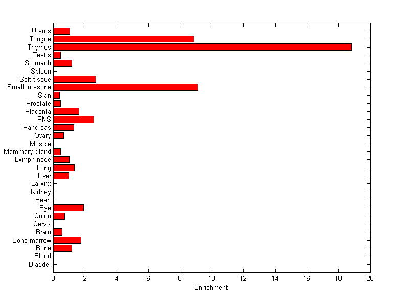 The expression level is normalized with tissue-library size. Each value for a gene in a tissue is a ratio of observed ESTs to the expected one in this tissue. The expected number of ESTs is the product of total ESTs of the gene and the fraction of total ESTs in the tissue among all ESTs in 30 tissues.