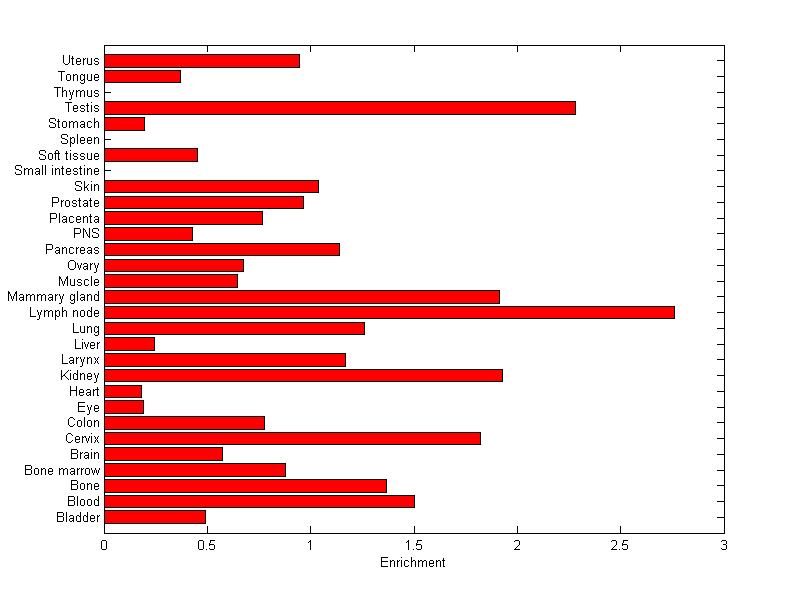 The expression level is normalized with tissue-library size. Each value for a gene in a tissue is a ratio of observed ESTs to the expected one in this tissue. The expected number of ESTs is the product of total ESTs of the gene and the fraction of total ESTs in the tissue among all ESTs in 30 tissues.