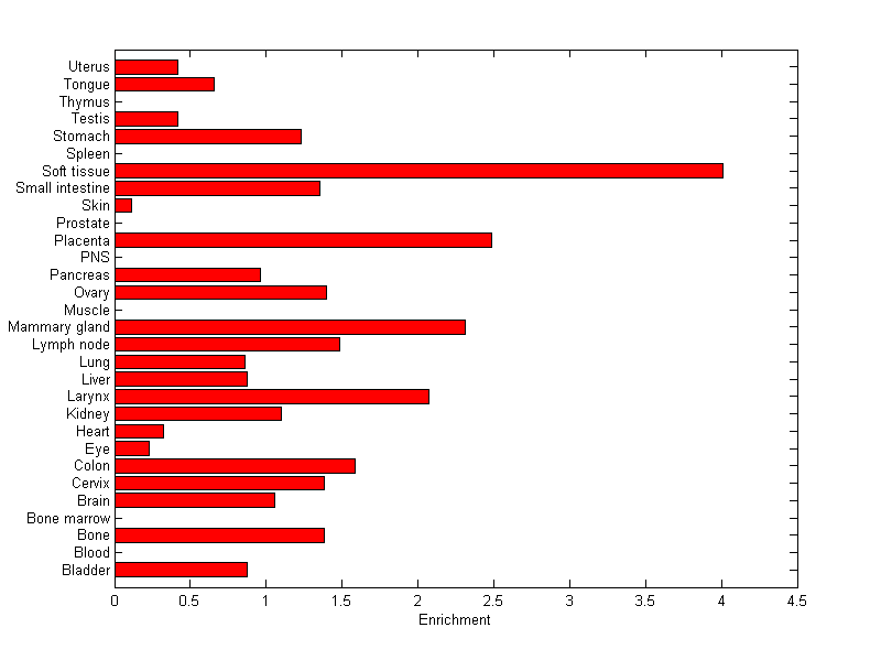 The expression level is normalized with tissue-library size. Each value for a gene in a tissue is a ratio of observed ESTs to the expected one in this tissue. The expected number of ESTs is the product of total ESTs of the gene and the fraction of total ESTs in the tissue among all ESTs in 30 tissues.