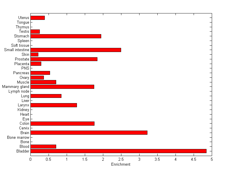 The expression level is normalized with tissue-library size. Each value for a gene in a tissue is a ratio of observed ESTs to the expected one in this tissue. The expected number of ESTs is the product of total ESTs of the gene and the fraction of total ESTs in the tissue among all ESTs in 30 tissues.