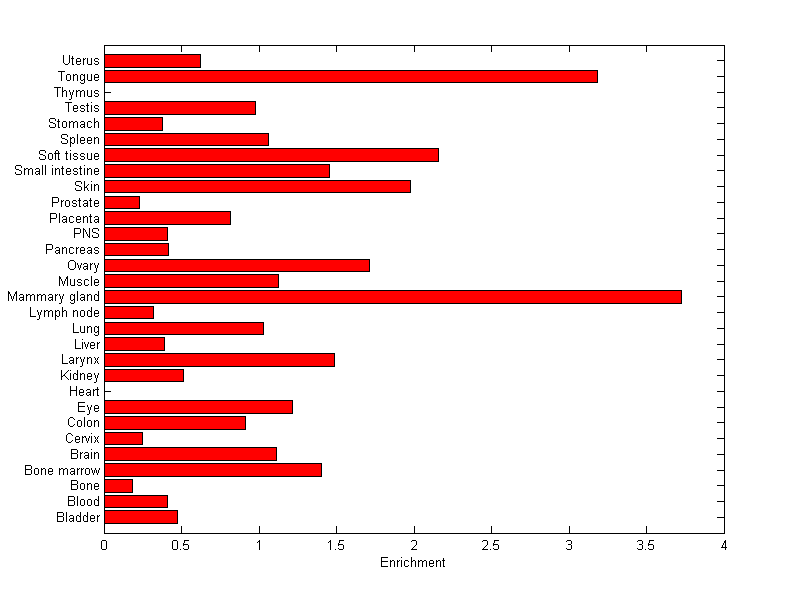 The expression level is normalized with tissue-library size. Each value for a gene in a tissue is a ratio of observed ESTs to the expected one in this tissue. The expected number of ESTs is the product of total ESTs of the gene and the fraction of total ESTs in the tissue among all ESTs in 30 tissues.