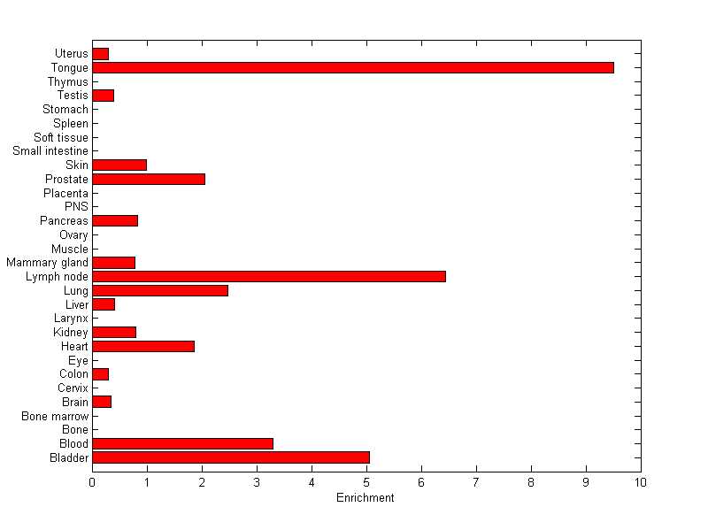 About the profile: The expression level is normalized with tissue-library size. Each value for a gene in a tissue is a ratio of observed ESTs to the expected one in this tissue. The expected number of ESTs is the product of total ESTs of the gene and the fraction of total ESTs in the tissue among all ESTs in 30 tissues. Summary: This gene is preferentially expressed in [lymph_node, tongue] Download: |