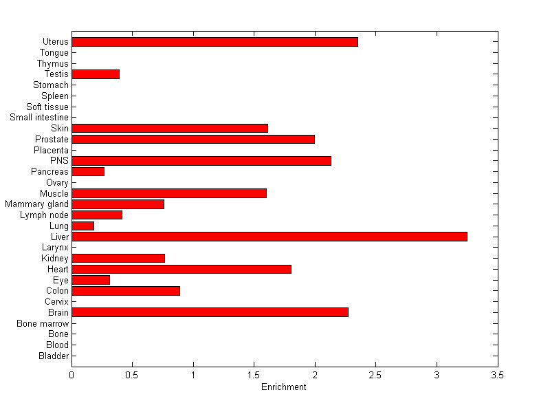 The expression level is normalized with tissue-library size. Each value for a gene in a tissue is a ratio of observed ESTs to the expected one in this tissue. The expected number of ESTs is the product of total ESTs of the gene and the fraction of total ESTs in the tissue among all ESTs in 30 tissues.