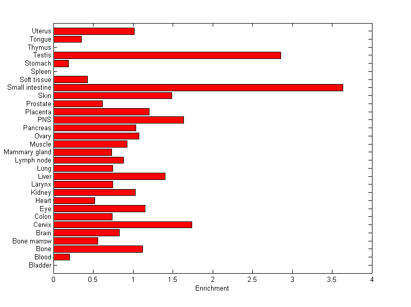 The expression level is normalized with tissue-library size. Each value for a gene in a tissue is a ratio of observed ESTs to the expected one in this tissue. The expected number of ESTs is the product of total ESTs of the gene and the fraction of total ESTs in the tissue among all ESTs in 30 tissues.