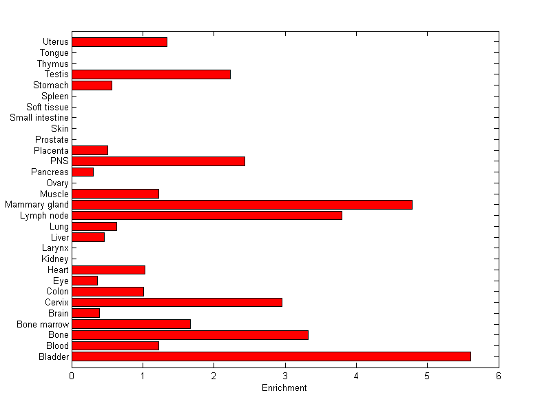 The expression level is normalized with tissue-library size. Each value for a gene in a tissue is a ratio of observed ESTs to the expected one in this tissue. The expected number of ESTs is the product of total ESTs of the gene and the fraction of total ESTs in the tissue among all ESTs in 30 tissues.