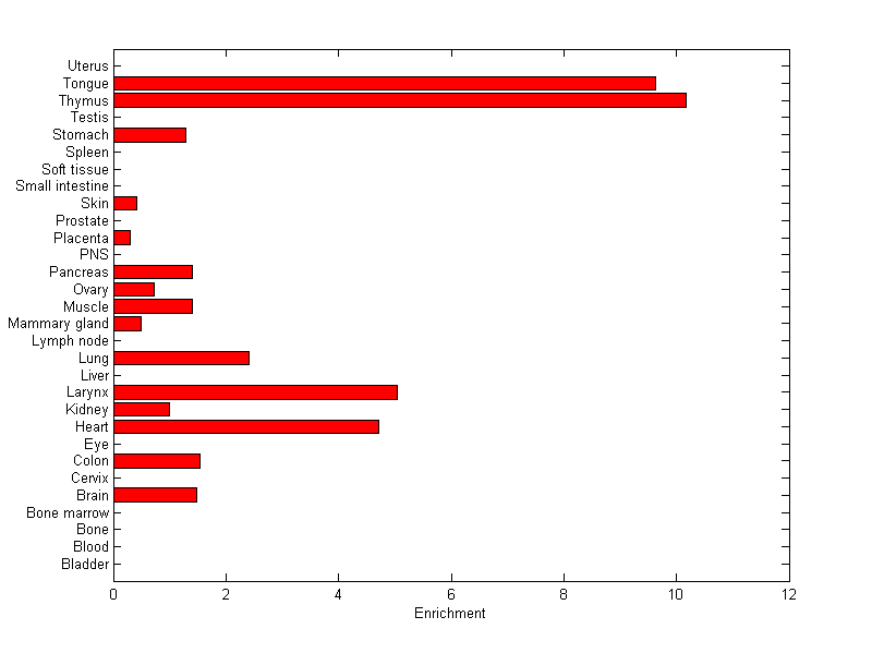 The expression level is normalized with tissue-library size. Each value for a gene in a tissue is a ratio of observed ESTs to the expected one in this tissue. The expected number of ESTs is the product of total ESTs of the gene and the fraction of total ESTs in the tissue among all ESTs in 30 tissues.