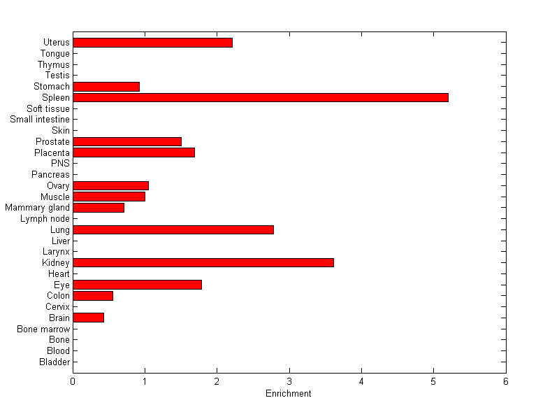 The expression level is normalized with tissue-library size. Each value for a gene in a tissue is a ratio of observed ESTs to the expected one in this tissue. The expected number of ESTs is the product of total ESTs of the gene and the fraction of total ESTs in the tissue among all ESTs in 30 tissues.