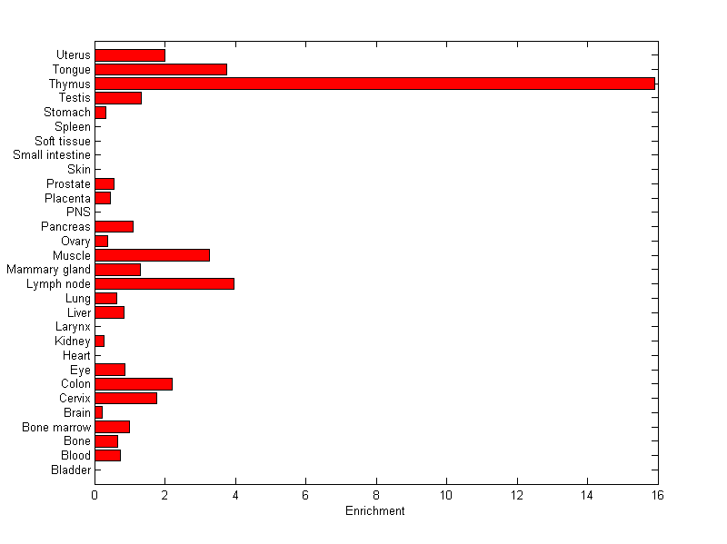 The expression level is normalized with tissue-library size. Each value for a gene in a tissue is a ratio of observed ESTs to the expected one in this tissue. The expected number of ESTs is the product of total ESTs of the gene and the fraction of total ESTs in the tissue among all ESTs in 30 tissues.