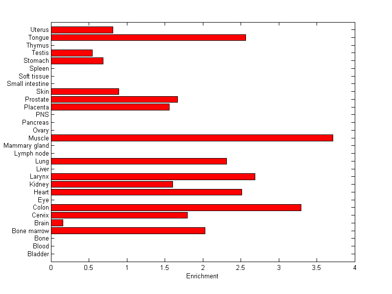 The expression level is normalized with tissue-library size. Each value for a gene in a tissue is a ratio of observed ESTs to the expected one in this tissue. The expected number of ESTs is the product of total ESTs of the gene and the fraction of total ESTs in the tissue among all ESTs in 30 tissues.